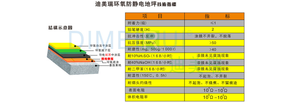 防靜電電阻值106-109Ω;導(dǎo)電電阻值104-106Ω; 面涂材料用量在:0.6-0.8 kg/m2;